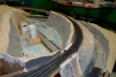 Glen Larsen, introduced last week, was put to work lightening the dark gray I applied last week to the rock cuts by adding a coat of light weight shackle thinned with water and some 'sandstone' acrylic paint.